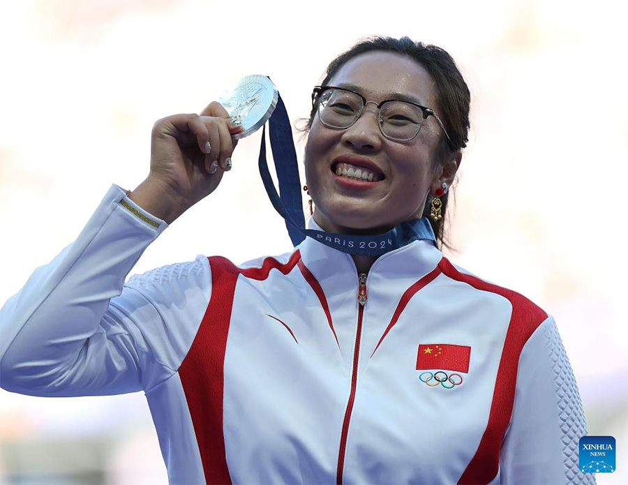 ?La medallista de plata Feng Bin de China muestra su medalla durante la ceremonia de victoria del lanzamiento de disco femenino de atletismo en los Juegos Olímpicos de París 2024, en París, Francia, el 6 de agosto de 2024. (Xinhua/Li Gang)