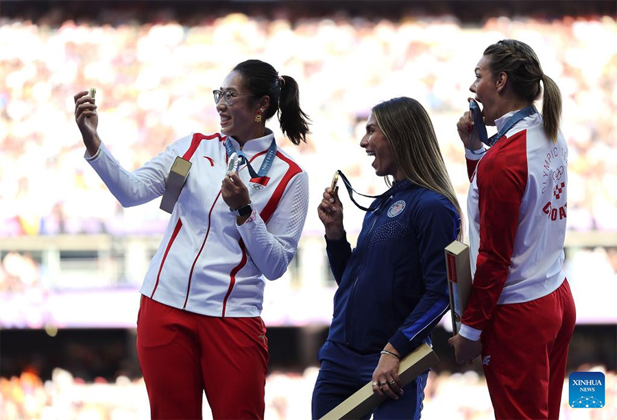 La medallista de oro Valarie Allman (c) de Estados Unidos, la medallista de plata Feng Bin (i) de China y la medallista de bronce Sandra Elkasevic de Croacia se toman fotografías durante la ceremonia de victoria del lanzamiento de disco femenino de atletismo en los Juegos Olímpicos de París 2024, en París, Francia, el 6 de agosto de 2024. (Xinhua/Li Gang)