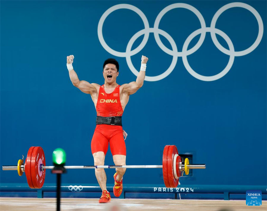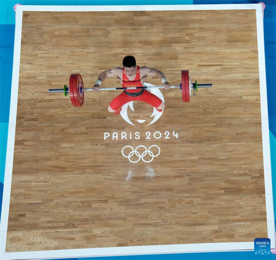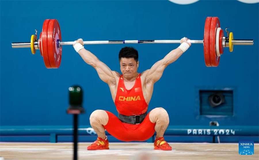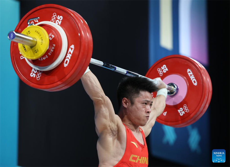 ?Li Fabin de China compite durante la competición de halterofilia masculina de 61 kilogramos en los Juegos Olímpicos de París 2024, en París, Francia, el 7 de agosto de 2024. (Xinhua/Yang Lei)