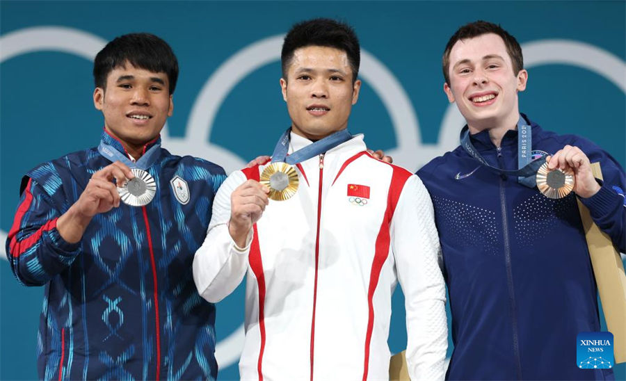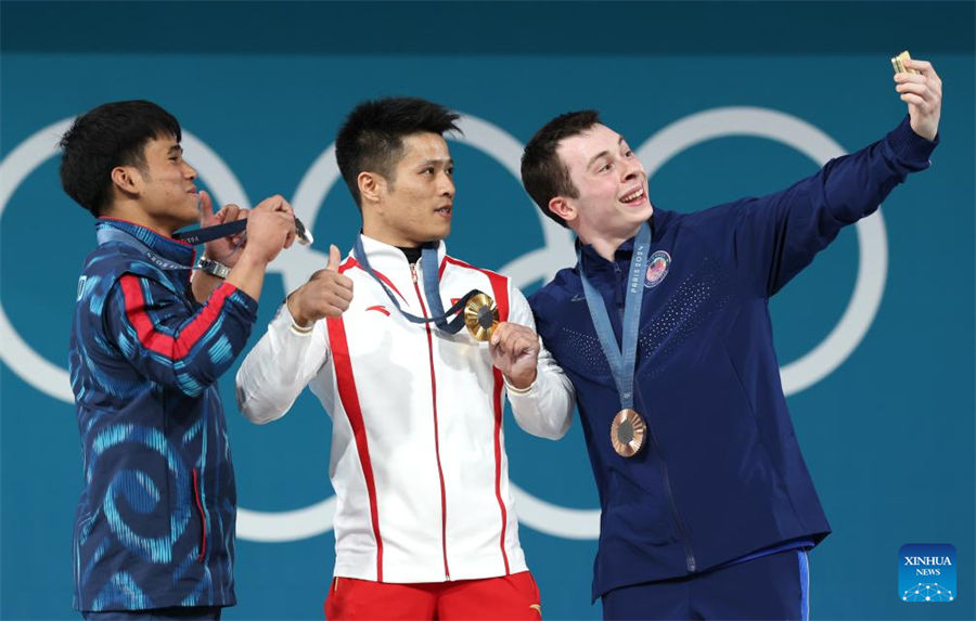 El medallista de oro Li Fabin (c) de China, el medallista de plata Theerapong Silachai (i) de Tailandia y el medallista de bronce Hampton Morris de Estados Unidos se toman fotografías durante la ceremonia de victoria de la competición de halterofilia masculina de 61 kilogramos en los Juegos Olímpicos de París 2024, en París, Francia, el 7 de agosto de 2024. (Xinhua/Yang Lei)