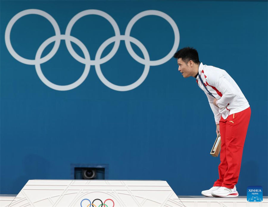 El medallista de oro Li Fabin de China reacciona durante la ceremonia de victoria de la competición de halterofilia masculina de 61 kilogramos en los Juegos Olímpicos de París 2024, en París, Francia, el 7 de agosto de 2024. (Xinhua/Yang Lei)