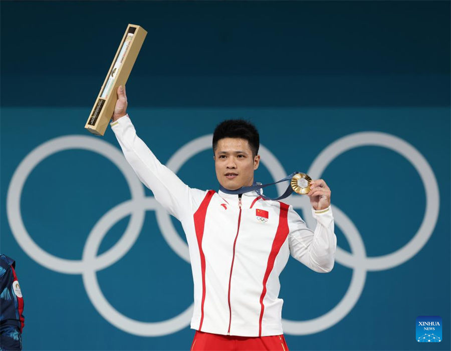 El medallista de oro Li Fabin de China posa para las fotografías durante la ceremonia de victoria de la competición de halterofilia masculina de 61 kilogramos en los Juegos Olímpicos de París 2024, en París, Francia, el 7 de agosto de 2024. (Xinhua/Yang Lei)