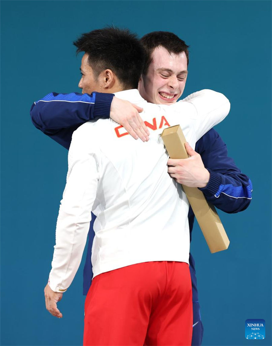 El medallista de oro Li Fabin (frente) de China se abraza con el medallista de bronce Hampton Morris de Estados Unidos durante la ceremonia de victoria de la competición de halterofilia masculina de 61 kilogramos en los Juegos Olímpicos de París 2024, en París, Francia, el 7 de agosto de 2024. (Xinhua/Yang Lei)
