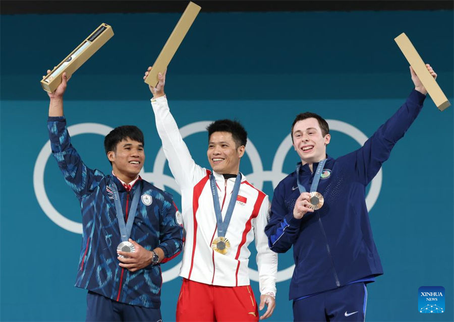 ?El medallista de oro Li Fabin (c) de China, el medallista de plata Theerapong Silachai (i) de Tailandia y el medallista de bronce Hampton Morris de Estados Unidos posan para las fotografías durante la ceremonia de victoria de la competición de halterofilia masculina de 61 kilogramos en los Juegos Olímpicos de París 2024, en París, Francia, el 7 de agosto de 2024. (Xinhua/Yang Lei)