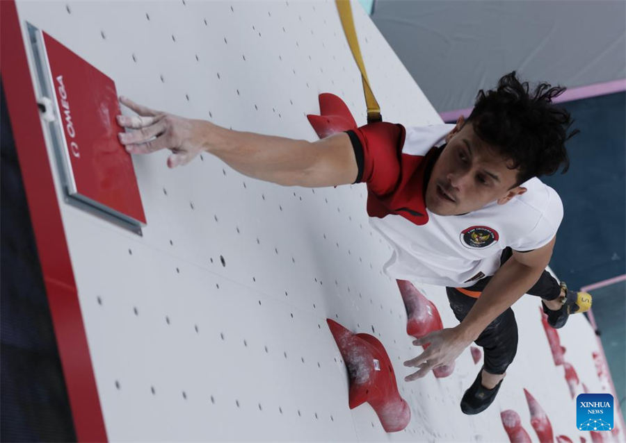 ?Veddriq Leonardo de Indonesia compite durante las competencias de velocidad masculinas de escalada deportiva en los Juegos Olímpicos de París 2024 en la sede de Escalada Deportiva de Le Bourget, cerca de París, Francia, el 8 de agosto de 2024. (Xinhua/Michael Reaves/POOL)