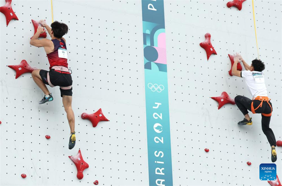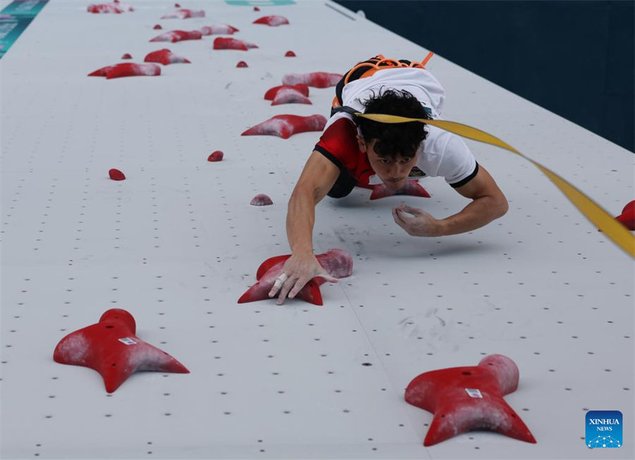 Wu Peng de China compite durante las competencias de velocidad masculinas de escalada deportiva en los Juegos Olímpicos de París 2024 en la sede de Escalada Deportiva de Le Bourget, cerca de París, Francia, el 8 de agosto de 2024. (Xinhua/Michael Reaves/POOL)