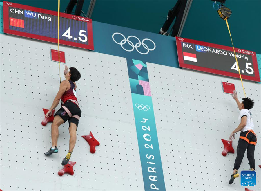 ?Veddriq Leonardo (d) de Indonesia compite con Wu Peng de China durante la final del evento de velocidad masculino de escalada deportiva en los Juegos Olímpicos de París 2024 en la sede de Escalada Deportiva de Le Bourget, cerca de París, Francia, el 8 de agosto de 2024. (Xinhua/Gao Jing)
