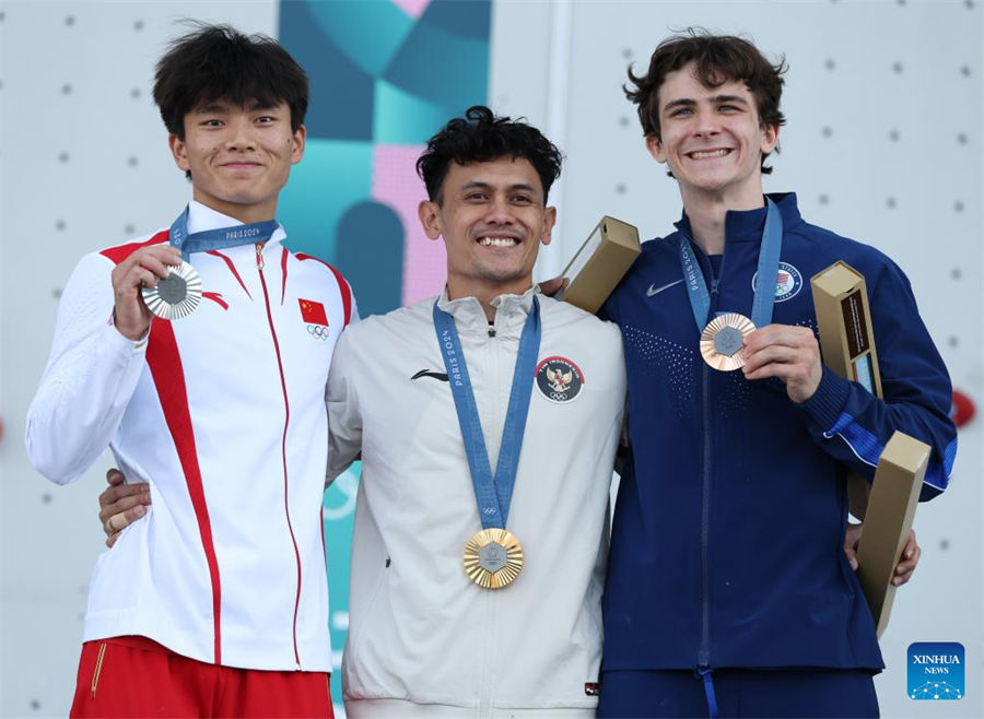 El medallista de oro Veddriq Leonardo (c) de Indonesia, el medallista de plata Wu Peng (i) de China y el medallista de bronce Sam Watson de Estados Unidos posan para fotografías durante la ceremonia de premiación luego de la final del evento de velocidad masculino de escalada deportiva en los Juegos Olímpicos de París 2024 en la sede de Escalada Deportiva de Le Bourget, cerca de París, Francia, el 8 de agosto de 2024. (Xinhua/Gao Jing)