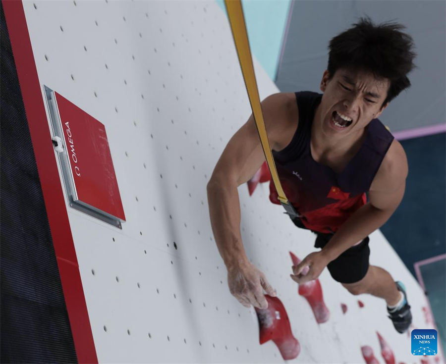 Wu Peng de China reacciona luego de los cuartos de final del evento de velocidad masculino de escalada deportiva en los Juegos Olímpicos de París 2024 en la sede de Escalada Deportiva de Le Bourget, cerca de París, Francia, el 8 de agosto de 2024. (Xinhua/Gao Jing)