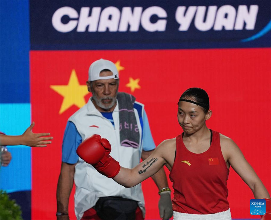 ?Chang Yuan de China llega al ring para la final de 54kg femenino de boxeo ante Hatice Akbas de Turquía en los Juegos Olímpicos de París 2024, en París, Francia, el 8 de agosto de 2024. (Xinhua/Jiang Wenyao)