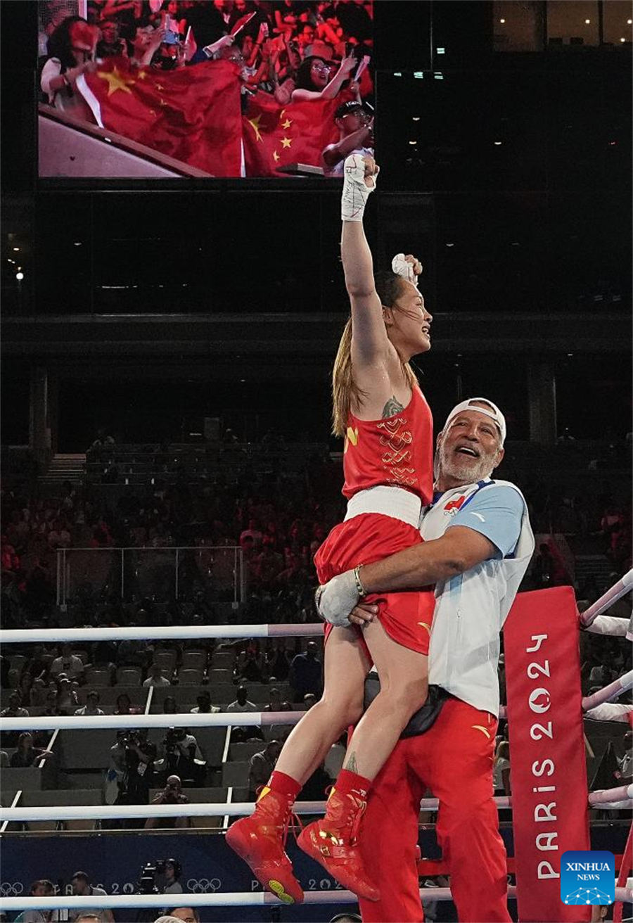 Chang Yuan de China festeja con su entrenador después de derrotar a Hatice Akbas de Turquía en la final de 54kg femenino de boxeo en los Juegos Olímpicos de París 2024, en París, Francia, el 8 de agosto de 2024. (Xinhua/Jiang Wenyao)