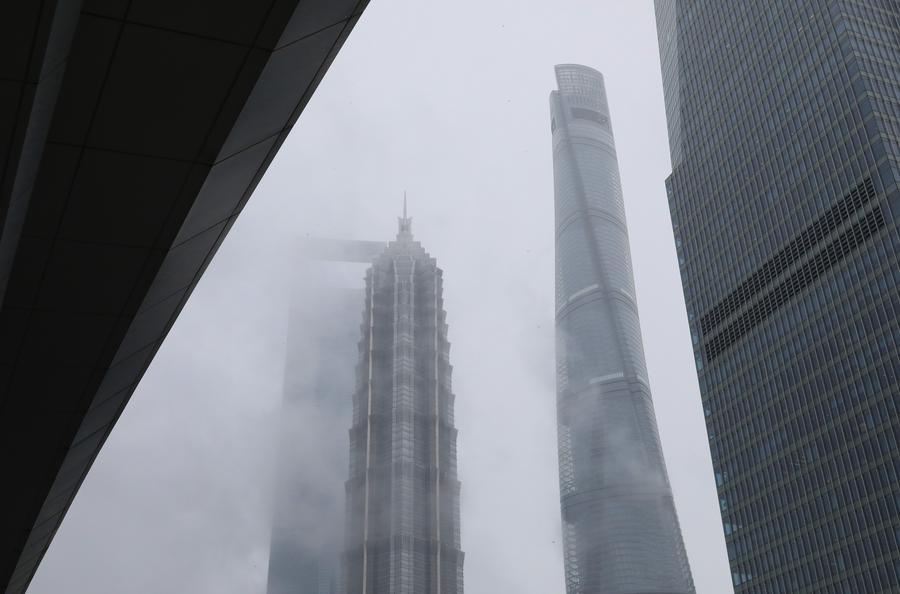 Rascacielos rodeados de nubes en Lujiazui, una zona financiera de Shanghai, en el este de China, el 19 de junio de 2024. (Xinhua/Fang Zhe)