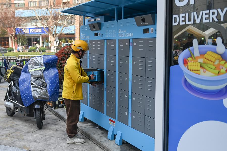Un repartidor se prepara para cambiar la batería de una motocicleta eléctrica en el denominado "espacio de los repartidores" en el distrito de Gongshu, en Hangzhou, capital de la provincia de Zhejiang, en el este de China, el 15 de marzo de 2024. (Xinhua/Huang Zongzhi)