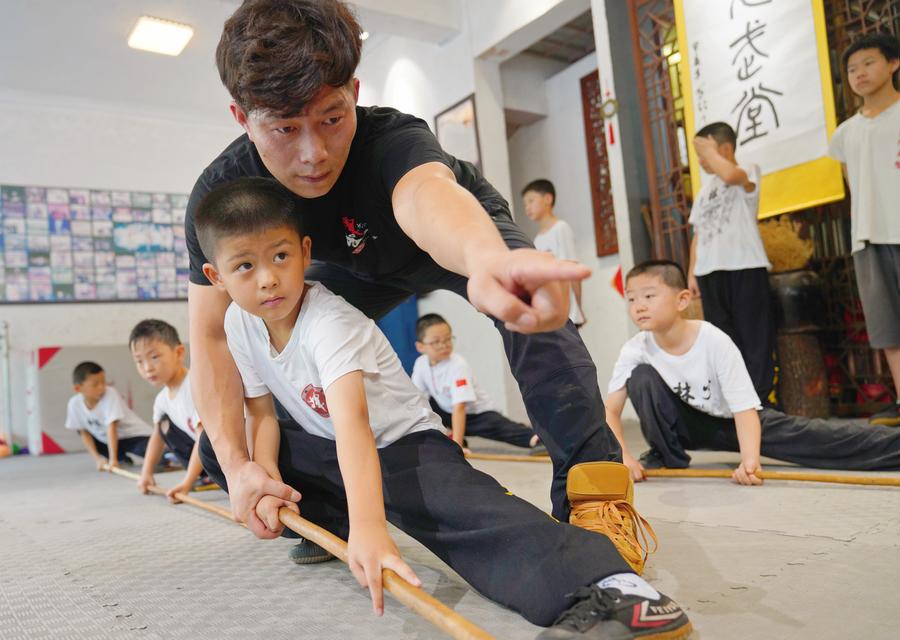 Un profesor de artes marciales da una clase a estudiantes en el poblado de Huagang, en el distrito de Feixi, en Hefei, capital de la provincia de Anhui, en el este de China, el 19 de julio de 2024. (Xinhua/Ma Jiagui)