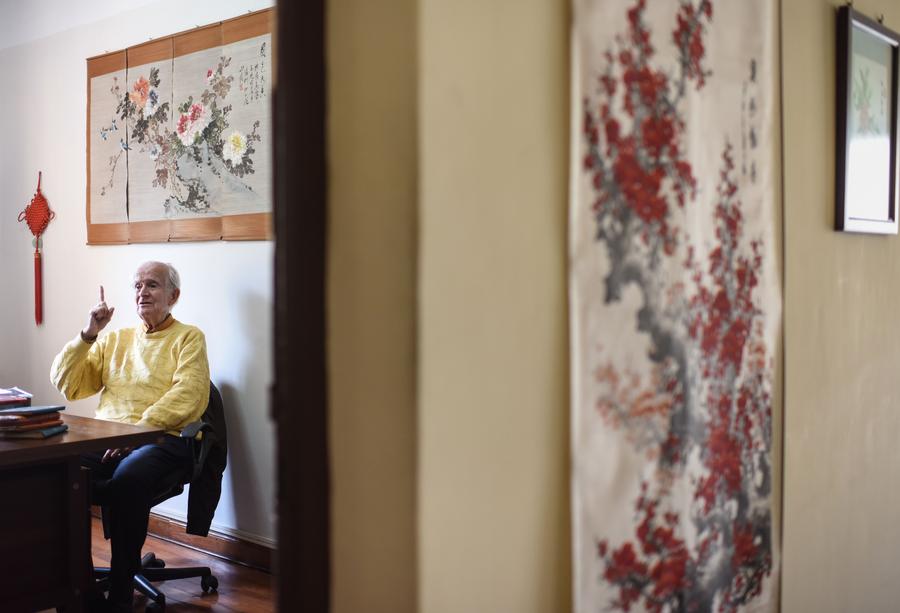 Guillermo Da?ino cuenta a Xinhua su historia con China, en su casa de Lima, Perú, el 8 de noviembre de 2016. Su hogar está lleno de caligrafía, pinturas y artesanías chinas, y en broma lo llama "China Town". (Xinhua/Shen Hong)