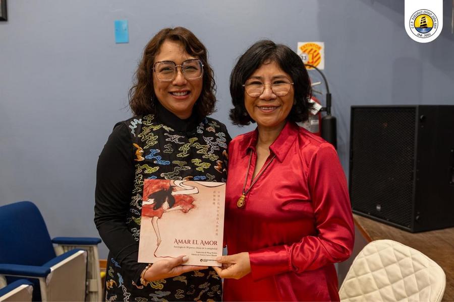 La sinóloga peruana Patricia Castro (d) y Jennifer Paján Lan (i), directora del Colegio Peruano Chino Juan XXIII, presentan conjuntamente la obra de Castro "Amar el amor: Antología de 38 poetas chinas de la antigüedad", en Perú, el 24 de septiembre de 2024. (Proporcionado por entrevistados)