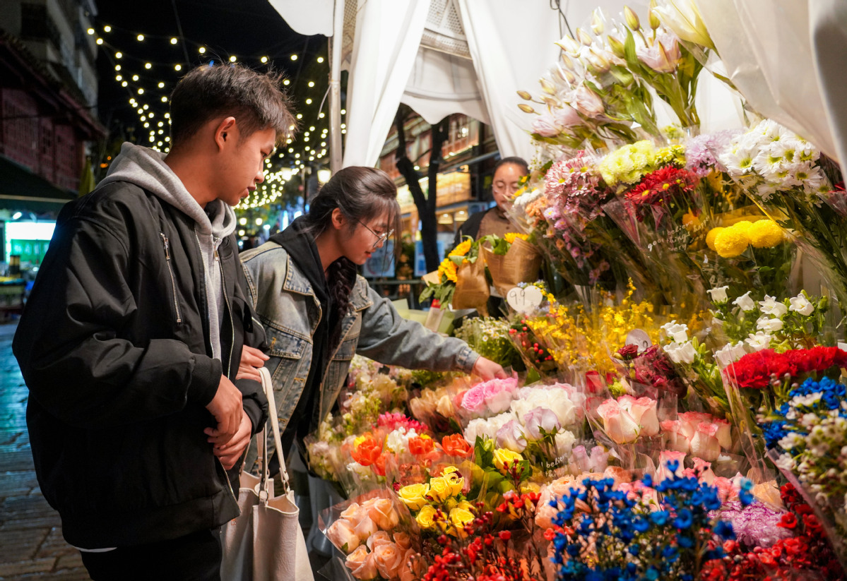 Turistas compran flores en un puesto nocturno de Kunming, provincia de Yunnan, 6 de diciembre de 2024. [Foto: Xinhua]