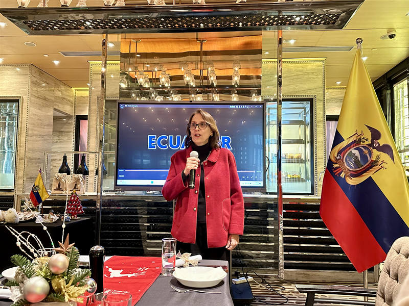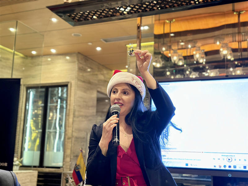 | María Soledad Córdova Montero, embajadora del Ecuador en China, interviene en una actividad sobre las tradiciones navide?as ecuatorianas, Beijing, 12 de diciembre del 2024. (Foto: Zhou Yu/ Diario del Pueblo digital) |