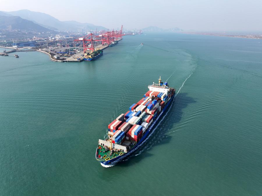 Vista aérea mostrando un buque cargado de contenedores saliendo del puerto de Lianyungang, provincia de Jiangsu, en el este de China, el 10 de diciembre de 2024. (Xinhua/Wang Chun)