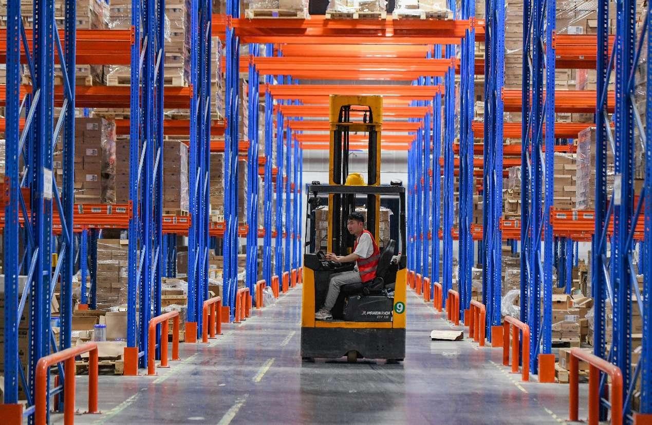 | Un hombre trabaja en un almacén de productos importados en la Zona Franca Integral de Jinyi, en Jinhua, provincia oriental china de Zhejiang. (Foto de Shi Kuanbing/Diario del Pueblo digital) |