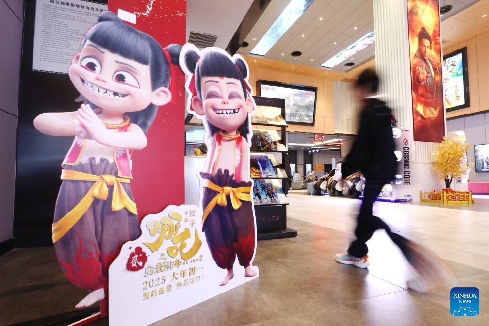 Un espectador camina frente a carteles de una película en un cine, en la ciudad de Jiaxing, en la provincia de Zhejiang, en el este de China, el 3 de febrero de 2025. La industria cinematográfica de China marcó un nuevo hito durante las vacaciones de la Fiesta de la Primavera de 2025, con ingresos de taquilla entre el 29 de enero y el 1 de febrero que alcanzaron un récord de 5.750 millones de yuanes (unos 802 millones de dólares), superando el máximo anterior de 5.730 millones de yuanes en 2021. (Xinhua/Jin Peng)