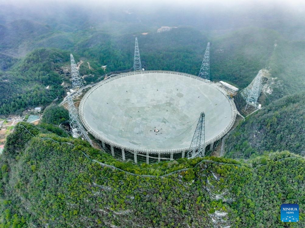 Vista aérea tomada con un dron el 18 de febrero de 2025 del Radiotelescopio Esférico de Apertura de Quinientos Metros (FAST, por sus siglas en inglés) de China en mantenimiento, en la provincia de Guizhou, en el suroeste de China. En los últimos a?os, Guizhou ha aprovechado sus recursos de investigación científica como el FAST para desarrollar viajes educativos por la ciencia, una opción favorable en toda China para las mentes inquisitivas que buscan embarcarse en un viaje de conocimiento y exploración en la ciencia. Por ejemplo, FAST, el radiotelescopio de un solo plato más grande del mundo, atrajo a 1.298 millones de visitantes para viajes educativos para la ciencia en 2024. (Xinhua/Ou Dongqu)