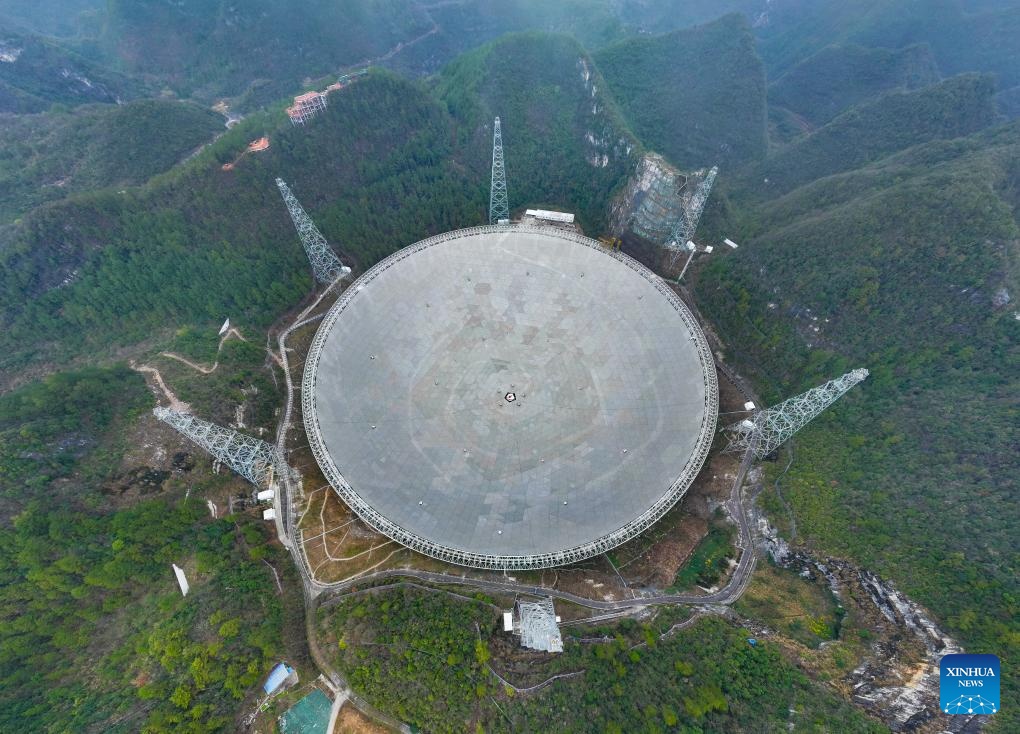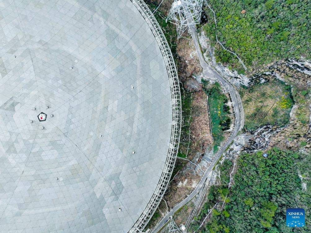 Vista aérea tomada con un dron el 18 de febrero de 2025 del Radiotelescopio Esférico de Apertura de Quinientos Metros (FAST, por sus siglas en inglés) de China en mantenimiento, en la provincia de Guizhou, en el suroeste de China. En los últimos a?os, Guizhou ha aprovechado sus recursos de investigación científica como el FAST para desarrollar viajes educativos por la ciencia, una opción favorable en toda China para las mentes inquisitivas que buscan embarcarse en un viaje de conocimiento y exploración en la ciencia. Por ejemplo, FAST, el radiotelescopio de un solo plato más grande del mundo, atrajo a 1.298 millones de visitantes para viajes educativos para la ciencia en 2024. (Xinhua/Liu Xu)