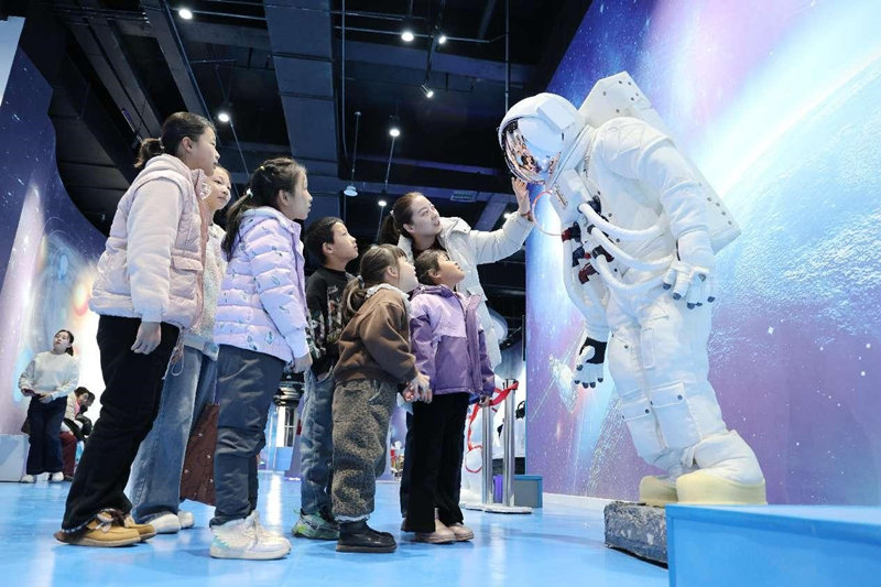Los ni?os aprenden sobre las funciones y la estructura de un traje espacial en un museo de ciencias en Zhangye, provincia de Gansu, noroeste de China, el 17 de enero de 2025. (Foto de Zhang Yuan/Diario del Pueblo digital) |