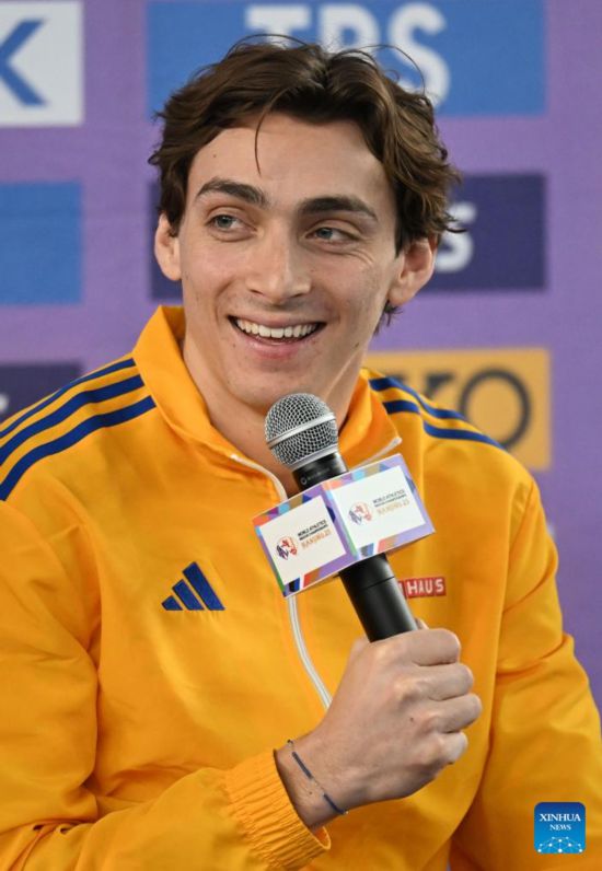 Mondo Duplantis, de Suecia, habla durante una conferencia de prensa para el Campeonato Mundial de Atletismo en Pista Cubierta, en Nanjing, en la provincia de Jiangsu, en el este de China, el 20 de marzo de 2025. (Xinhua/Song Yanhua)