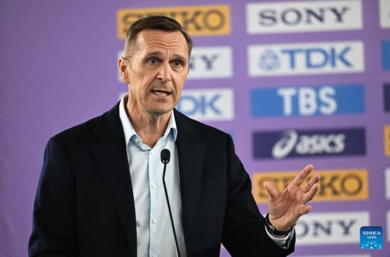 Jon Ridgeon, director ejecutivo de World Athletics, habla durante una conferencia de prensa para el Campeonato Mundial de Atletismo en Pista Cubierta, en Nanjing, en la provincia de Jiangsu, en el este de China, el 20 de marzo de 2025. (Xinhua/Song Yanhua)