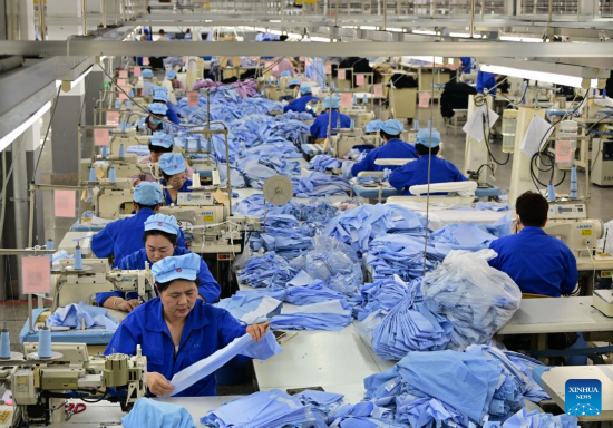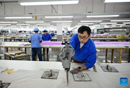 QINGDAO, 26 marzo, 2025 (Xinhua) -- Imagen del 25 de marzo de 2025 de trabajadores de una empresa textil en un parque industrial utilizando máquinas de coser inteligentes para la producción, en el distrito de Jimo de la ciudad de Qingdao, en la provincia de Shandong, en el este de China. El distrito de Jimo de la ciudad de Qingdao ha guiado continuamente a las empresas privadas para aumentar la I+D y la inversión en nuevas tecnologías, nuevos equipos y nuevas tecnologías de procesamiento en los últimos a?os. Mientras tanto, con medidas para satisfacer las necesidades de empleo de las empresas y brindar capacitación laboral a los residentes, se ha promovido de manera efectiva el desarrollo sostenible y de calidad de la industria textil y de la confección, y muchos residentes locales han conseguido empleo y han visto aumentar sus ingresos. (Xinhua/Li Ziheng)