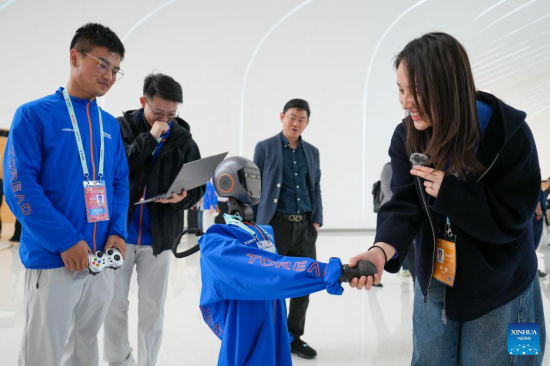 BEIJING, 27 marzo, 2025 (Xinhua) -- Un robot humanoide estrecha la mano con una periodista en el Centro Internacional de Innovación Zhongguancun, sede de la Conferencia Anual del Foro Zhongguancun 2025 (Foro ZGC), en Beijing, capital de China, el 27 de marzo de 2025. Bajo el lema "Nuevas fuerzas productivas de calidad y cooperación tecnológica global", la conferencia anual del foro de este a?o presenta las últimas tecnologías y productos en robots humanoides. (Xinhua/Ju Huanzong)