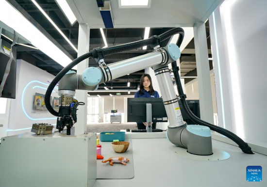 SHIJIAZHUANG, 31 marzo, 2025 (Xinhua) -- Imagen del 26 de marzo de 2025 de una empleada de una compa?ía de ciencia y tecnología en el Parque Científico de Zhongguancun demostrando un robot industrial, en la Nueva Area de Xiong'an, en la provincia de Hebei, en el norte de China. Desde que China anunció sus planes para establecer la Nueva Area de Xiong'an en abril de 2017, esta ha evolucionado desde un proyecto a una ciudad vibrante. La Nueva Area de Xiong'an ha sido dise?ada para asumir funciones transferidas desde Beijing que no son esenciales para su papel como capital de China. En Xiong'an, considerada la "ciudad del futuro" de China, la innovación científica y tecnológica y el desarrollo industrial se impulsan mutuamente de forma sinérgica. El Parque Científico de Zhongguancun en Xiong'an ha atraído a más de 140 empresas. El centro de innovación científica y tecnológica de la nueva área ha construido un sistema de transformación de logros con una estrecha integración de diversas entidades de innovación. (Xinhua/Mu Yu)