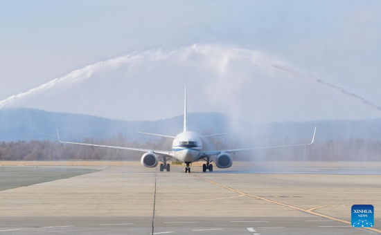 VLADIVOSTOK, 1 abril, 2025 (Xinhua) -- Imagen del 31 de marzo de 2025 del vuelo inaugural de una nueva ruta Beijing-Vladivostok lanzada por Air China llegando al Aeropuerto Internacional de Vladivostok, en Vladivostok, Rusia. Air China ha lanzado oficialmente su nuevo servicio de vuelo de ida y vuelta Beijing-Vladivostok, marcando la ocasión con la celebración del vuelo inaugural en el Aeropuerto Internacional de Vladivostok. (Xinhua/Guo Feizhou)