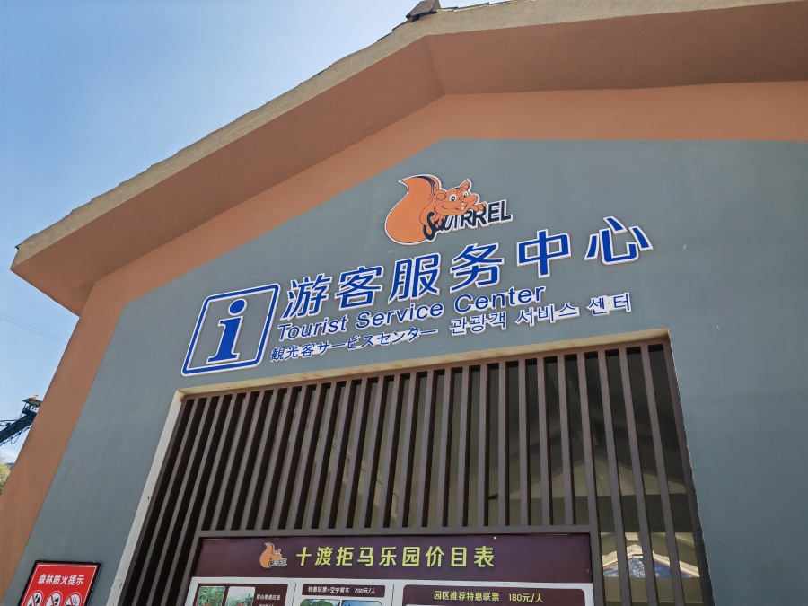 Un centro de servicio de turistas con el letrero de cuatro idiomas en Shidu, distrito de Fangshan, en Beijing. (Foto: Liu Xuxia)