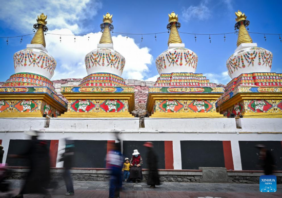 YUSHU, 8 abril, 2025 (Xinhua) -- Imagen del 6 de abril de 2025 de personas orando mientras rodean el montículo de piedras mani de Jiana, en la ciudad de Yushu, en la prefectura autónoma tibetana de Yushu, en la provincia de Qinghai, en el noroeste de China. El montículo de piedras mani de Jiana es una reliquia cultural bajo protección nacional. Está compuesto por miles de millones de piedras mani y es utilizado por los habitantes cuando sostienen ruedas de oración y murmuran la oración de seis sílabas para cumplir su ritual diario. (Xinhua/Qi Zhiyue)