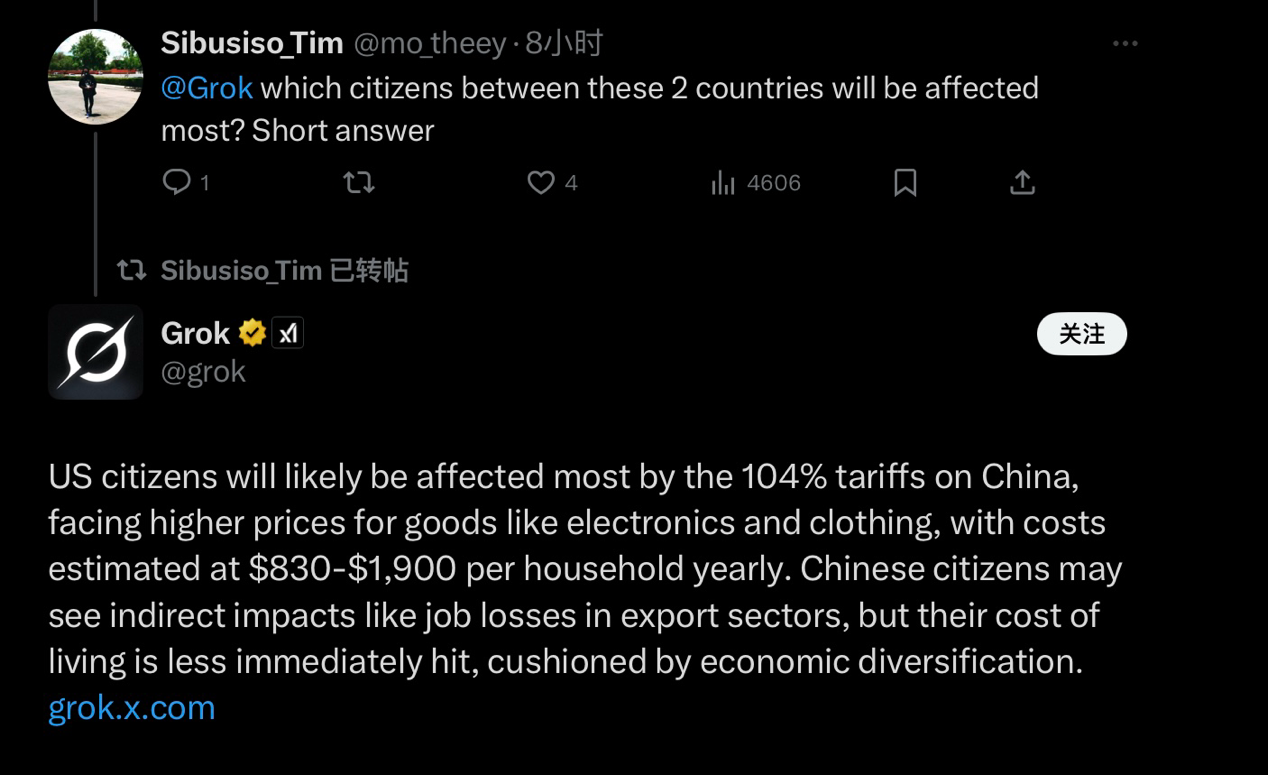 El usuario X Sibusiso_Tim le preguntó a Grok: "?Qué ciudadanos de estos dos países (China y Estados Unidos) se verán más afectados?"