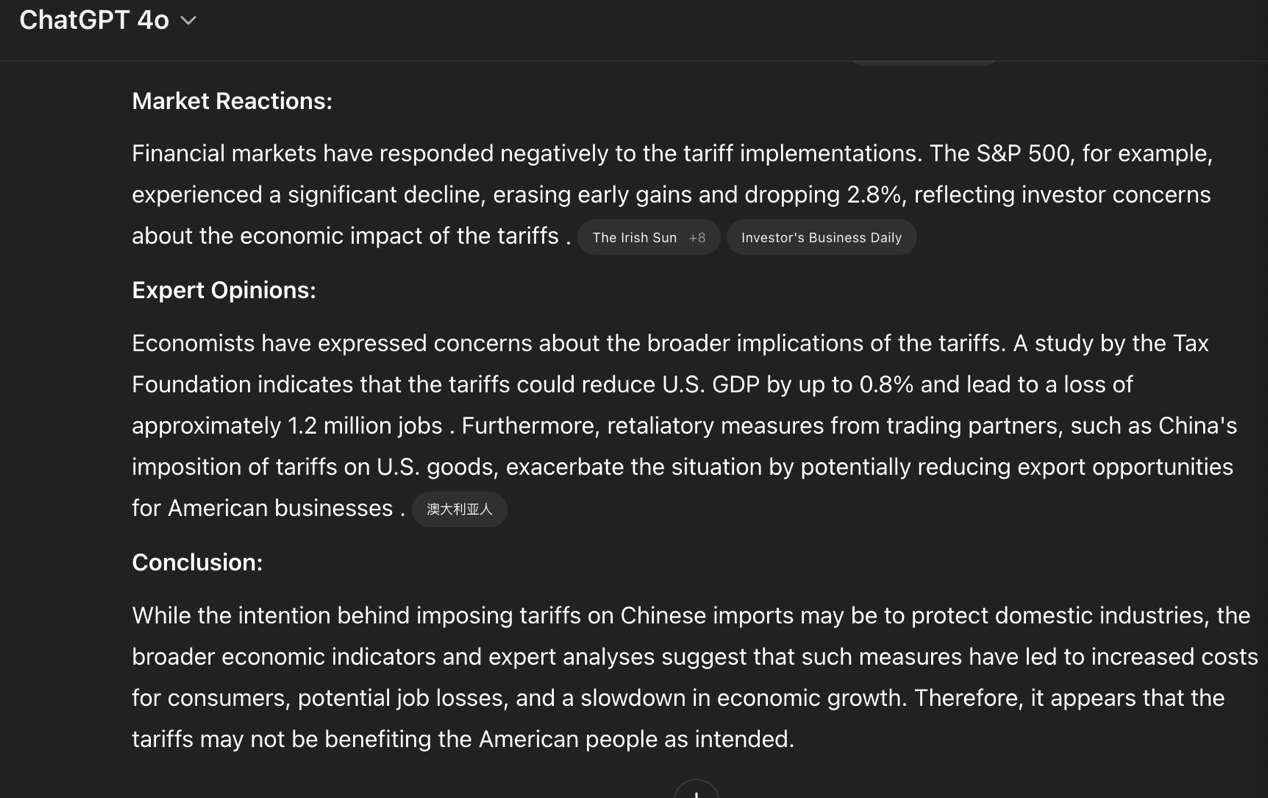 Otra IA estadounidense, ChatGPT, ha expresado su preocupación de que los estadounidenses de a pie puedan sentir los efectos de los aranceles en China. "Los indicadores económicos más amplios y los análisis de los expertos sugieren que tales medidas han provocado un aumento de los costos para los consumidores, posibles pérdidas de empleos y una desaceleración del crecimiento económico", dijo ChatGPT en respuesta a una pregunta sobre si los aranceles del gobierno de EE. UU. a China lograrían o no su objetivo de restaurar la prosperidad en el país.