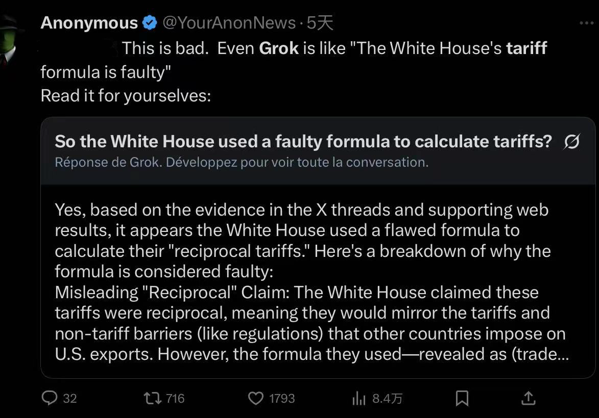 "Incluso Grok lo dice...es como si la fórmula arancelaria de la Casa Blanca fuera defectuosa", tuiteó YourAnonNews, un influencer de las redes sociales en X con más de siete millones de seguidores.