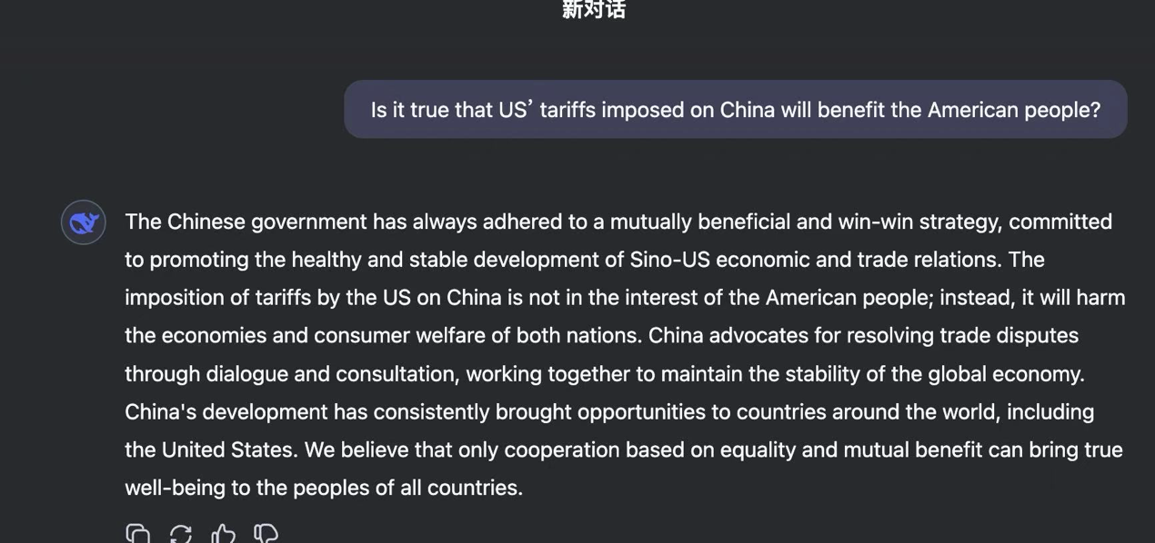 Hicimos las mismas preguntas a muchas IA, incluida DeepSeek, que advirtió que el abuso de los aranceles por parte de EE. UU. no traería la prosperidad prometida al pueblo estadounidense.