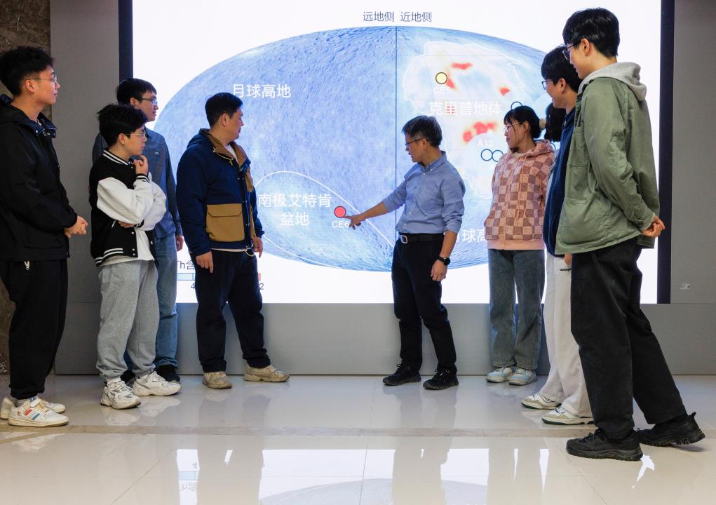 BEIJING, 10 abril, 2025 (Xinhua) -- Imagen del 8 de abril de 2025 del investigador principal, Hu Sen (5-i), explicando el resultado de la investigación al equipo de investigación en el Instituto de Geología y Geofísica de la Academia de Ciencias de China, en Beijing, capital de China. El último descubrimiento de muestras de rocas traídas por la misión lunar Chang'e-6 de China revela que el manto lunar contiene menos agua en el lado oculto que en el lado visible, lo que sugiere que el "hemisferio oculto", que siempre mira en dirección opuesta a la Tierra, tiende a ser mucho más seco. Publicado el miércoles en la revista Nature, un nuevo estudio realizado por científicos chinos descubrió que el contenido de agua en cada gramo de la gruesa capa rocosa bajo la superficie del lado oculto de la luna es inferior a 2 microgramos, el nivel más bajo jamás registrado. (Xinhua/Jin Liwang)