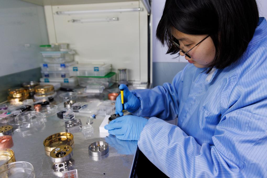BEIJING, 10 abril, 2025 (Xinhua) -- Imagen del 8 de abril de 2025 de una investigadora trabajando con la muestra lunar que será analizada en el Laboratorio del Espectrómetro de Masas de Iones Nano Secundarios (NanoSIMS Lab, por sus siglas en inglés) del Instituto de Geología y Geofísica de la Academia de Ciencias de China, en Beijing, capital de China. El último descubrimiento de muestras de rocas traídas por la misión lunar Chang'e-6 de China revela que el manto lunar contiene menos agua en el lado oculto que en el lado visible, lo que sugiere que el "hemisferio oculto", que siempre mira en dirección opuesta a la Tierra, tiende a ser mucho más seco. Publicado el miércoles en la revista Nature, un nuevo estudio realizado por científicos chinos descubrió que el contenido de agua en cada gramo de la gruesa capa rocosa bajo la superficie del lado oculto de la luna es inferior a 2 microgramos, el nivel más bajo jamás registrado. (Xinhua/Jin Liwang)