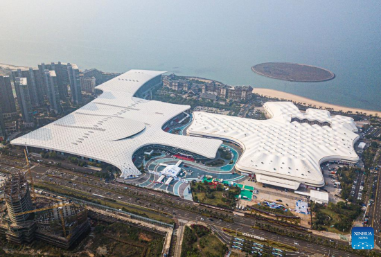 HAIKOU, 11 abril, 2025 (Xinhua) -- Vista aérea tomada con un dron el 10 de abril de 2025 del Centro Internacional de Convenciones y Exposiciones de Hainan, sede principal de la próxima V Exposición Internacional de Productos de Consumo de China (CICPE, por sus siglas en inglés), en Haikou, en la provincia de Hainan, en el sur de China. La V CICPE, que presenta ocho salas de exposición, esta agendada del 13 al 18 de abril aquí. La exposición, una plataforma clave para el comercio mundial y tendencias de consumo, ha atraído la participación de más de 4,100 marcas de 71 países y regiones. (Xinhua/Pu Xiaoxu)