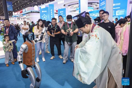 HAIKOU, 13 abril, 2025 (Xinhua) -- Un visitante portando un traje antiguo interactúa con un robot humanoide de Unitree Robotics en la V Exposición Internacional de Productos de Consumo de China (CICPE, por sus siglas en inglés), en Haikou, en la provincia de Hainan, en el sur de China, el 13 de abril de 2025. La V CICPE durará del 13 al 18 de abril en la provincia insular de Hainan, en el sur de China. Como la única exposición a nivel nacional de China centrada en bienes de consumo, la edición de este a?o pone énfasis en la innovación y la colaboración global. La exposición ha atraído la participación de más de 4.100 marcas de más de 70 países y regiones. (Xinhua/Zhang Liyun)