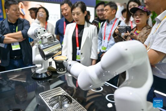 HAIKOU, 13 abril, 2025 (Xinhua) -- Visitantes observan un robot preparando café, en la V Exposición Internacional de Productos de Consumo de China (CICPE, por sus siglas en inglés), en Haikou, en la provincia de Hainan, en el sur de China, el 13 de abril de 2025. La V CICPE durará del 13 al 18 de abril en la provincia insular de Hainan, en el sur de China. Como la única exposición a nivel nacional de China centrada en bienes de consumo, la edición de este a?o pone énfasis en la innovación y la colaboración global. La exposición ha atraído la participación de más de 4.100 marcas de más de 70 países y regiones. (Xinhua/Guo Cheng)