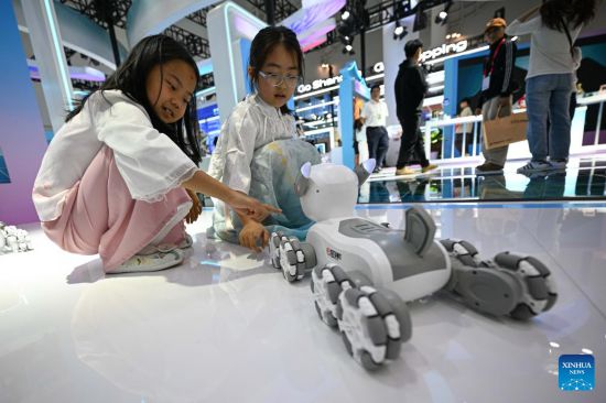 HAIKOU, 13 abril, 2025 (Xinhua) -- Ni?as juegan con un perro robot de juguete en la V Exposición Internacional de Productos de Consumo de China (CICPE, por sus siglas en inglés), en Haikou, en la provincia de Hainan, en el sur de China, el 13 de abril de 2025. La V CICPE durará del 13 al 18 de abril en la provincia insular de Hainan, en el sur de China. Como la única exposición a nivel nacional de China centrada en bienes de consumo, la edición de este a?o pone énfasis en la innovación y la colaboración global. La exposición ha atraído la participación de más de 4.100 marcas de más de 70 países y regiones. (Xinhua/Pu Xiaoxu)