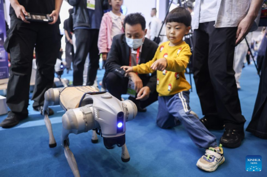 HAIKOU, 13 abril, 2025 (Xinhua) -- Un ni?o interactúa con un perro robot mostrado por Unitree Robotics en la V Exposición Internacional de Productos de Consumo de China (CICPE, por sus siglas en inglés), en Haikou, en la provincia de Hainan, en el sur de China. La V CICPE durará del 13 al 18 de abril en la provincia insular de Hainan, en el sur de China. Como la única exposición a nivel nacional de China centrada en bienes de consumo, la edición de este a?o pone énfasis en la innovación y la colaboración global. La exposición ha atraído la participación de más de 4.100 marcas de más de 70 países y regiones. (Xinhua/Zhang Liyun)