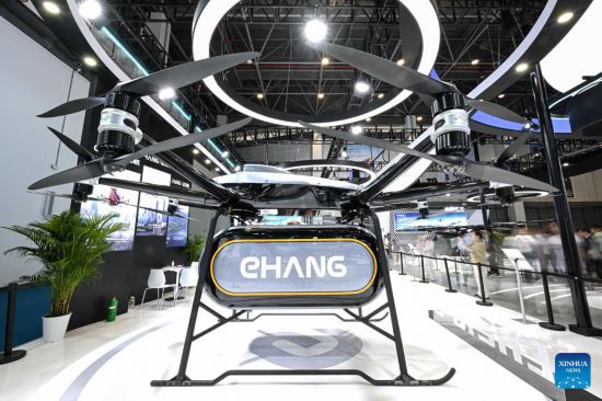 HAIKOU, 15 abril, 2025 (Xinhua) -- Imagen del 13 de abril de 2025 de la aeronave eléctrica de despegue y aterrizaje vertical (eVTOL, por sus siglas en inglés) no tripulada EH216-S de EHang en la V Exposición Internacional de Productos de Consumo de China (CICPE, por sus siglas en inglés), en Haikou, en la provincia de Hainan, en el sur de China. Programada del 13 al 18 de abril, la exposición de este a?o cuenta por primera vez con zonas de exposición dedicadas a innovaciones pioneras en inteligencia artificial (IA) y economía de baja altitud. La zona de economía de baja altitud, que debuta este a?o, exhibe aeronaves eVTOL, vehículos voladores y drones. (Xinhua/Guo Cheng)