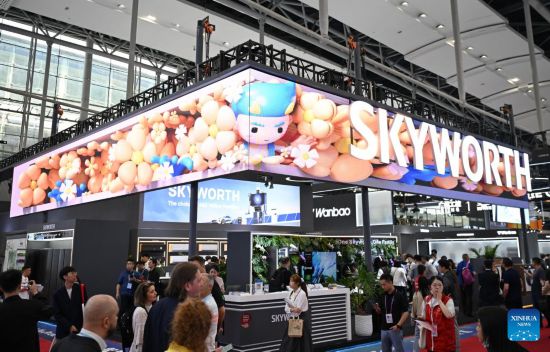 GUANGZHOU, 16 abril, 2025 (Xinhua) -- Imagen del 15 de abril de 2025 del estand de Skyworth Group de China visto en la zona de exposición de productos de vida inteligente durante la 137a edición de la Feria de Importación y Exportación de China, en Guangzhou, en la provincia de Guangdong, en el sur de China. La 137a edición de la Feria de Importación y Exportación de China, también conocida como la Feria de Cantón, se inauguró el martes, con el número de expositores de exportación superando los 30.000 por primera vez en la historia de este famoso evento. Productos que reflejan el concepto de innovación ecológica, incluidos dispositivos inteligentes de ahorro de energía y productos tecnológicos ecológicos, han ganado el favor de los comerciantes extranjeros durante la feria. (Xinhua/Deng Hua)