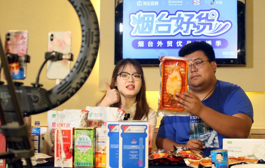 Dos streamers online promocionan productos de comercio exterior en Yantai, provincia de Shandong, al este de China, mediante transmisiones en vivo para atraer compradores extranjeros. Foto: VCG